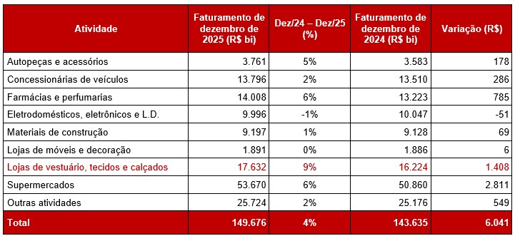 Ademais, a busca por presentes vai dinamizar alguns segmentos. Neste caso, as lojas de roupas e calçados serão as grandes beneficiadas, com a maior alta do mês (9%). Em números absolutos, será R$ 1,4 bilhão a mais de receitas.