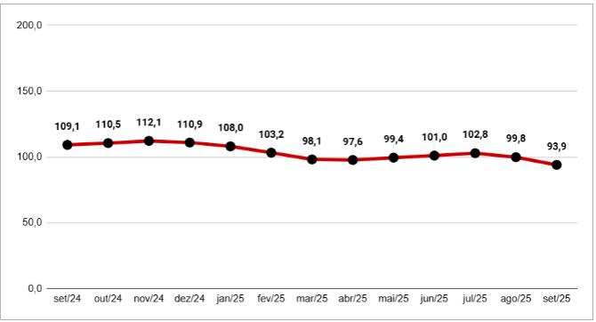 Esse recuo foi motivado, principalmente, pela deterioração das expectativas em relação ao futuro, que caiu 14,6% em setembro, registrando 104,2 pontos, menor patamar desde julho de 2020. Entre maio e setembro, essas expectativas desabaram 26,1%.