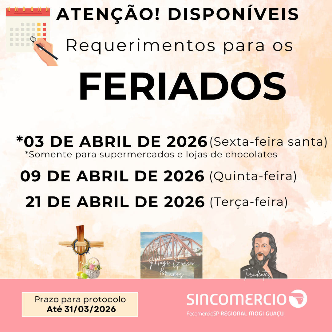 O Sincomercio informa que já estão disponíveis os requerimentos para os feriados do mês de ABRIL/2026, os requerimentos após assinados devem ser encaminhados ao Sincomercio, o prazo para protocolar é até 31/03/2026.