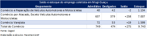 - Total do Comércio: 749 admissões; 474 desligamentos – saldo de +275 pessoas