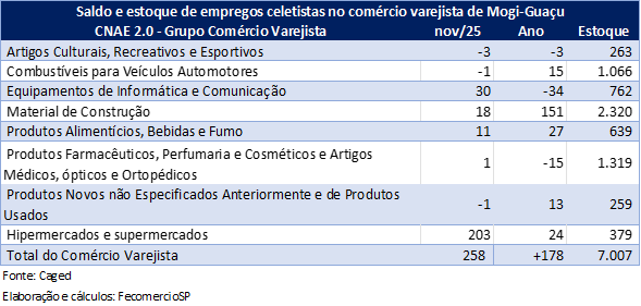 - Total do Comércio Varejista: Saldo mensal de 258 pessoas, saldo anual de +178 pessoas e estoque de postos de trabalho de 7.007 pessoas
