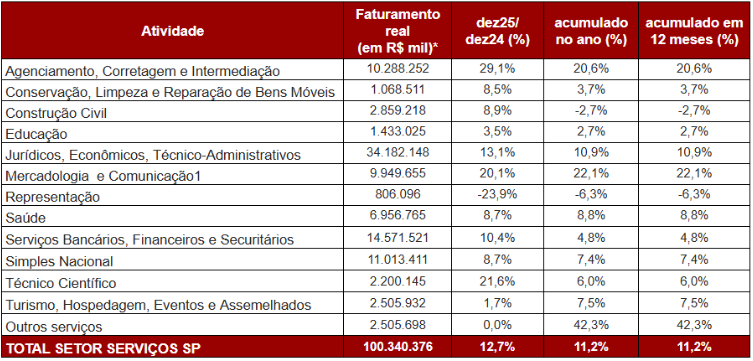 Sendo assim, é possível observar que o desempenho dos Serviços ao longo de 2025 foi marcado pelo crescimento relativamente disseminado entre as atividades, mesmo que em ritmos distintos, em que os serviços técnicos e profissionais, além dos intensivos em conhecimento técnico, se destacaram. Entretanto, juros elevados já influenciam o resultado de alguns segmentos — como a construção civil, que recuou 2,4%, enquanto o faturamento da atividade de representação caiu 6,3%.